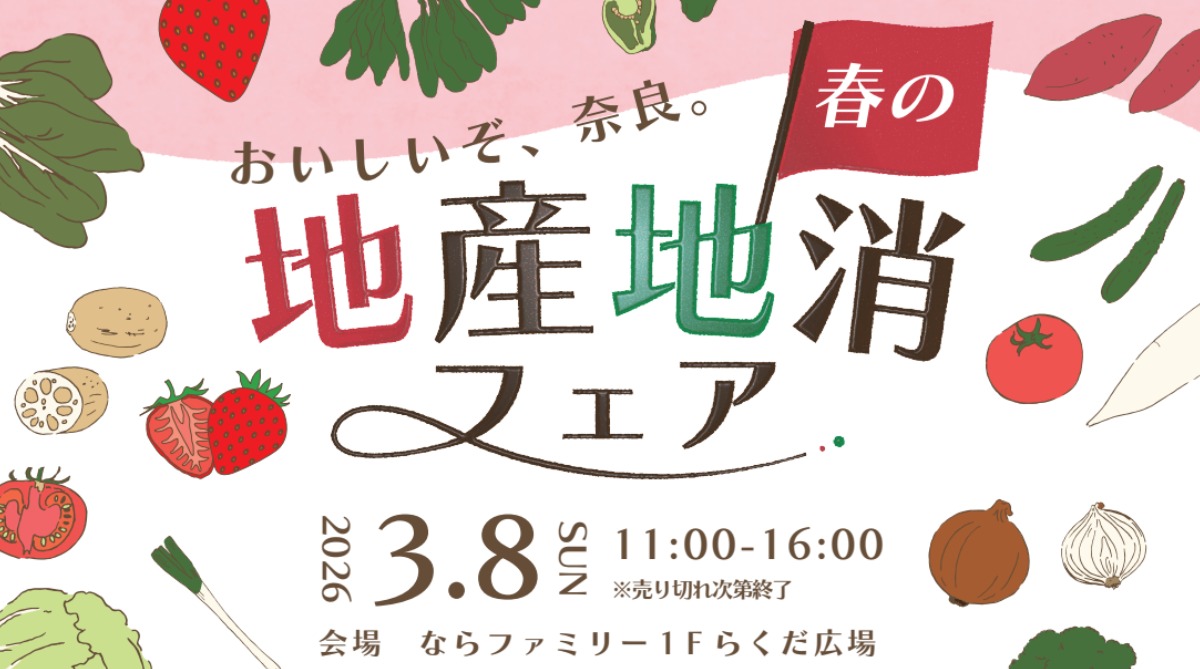 奈良市の食材の魅力をたっぷり味わえるイベント「おいしいぞ、奈良。春の地産地消フェア」が、来たる3月8日(日)、ならファミリー1Fらくだ広場で開催される。