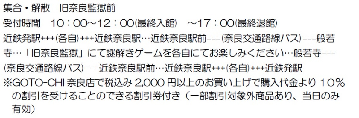 ※旅行代金には、近鉄運賃(往復)、バス運賃(往復)、旧奈良監獄見学費用、旧奈良監獄謎解きゲーム費用、および諸税が含まれます。また、他駅からの発設定もございます。