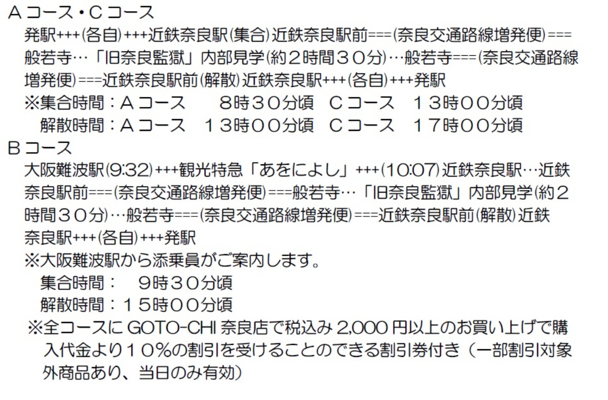 ※旅行代金には、近鉄運賃(往復)、片道特急料金(Bコース)、片道特別車両料金(Bコース)、バス運賃(往復)、旧奈良監獄見学費用、お土産(監獄どら焼き)、添乗費および諸税が含まれます。また、A・Cコースは他駅からの発設定もございます。