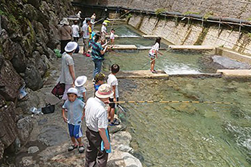 自然の渓流をそのまま生かした釣り場で、アマゴとマスの渓流釣りとつかみ取りが楽しめる。道具は全て借りることができるので、手ぶらで行けるのが嬉しい。澄んだ空気と緑あふれる場所で、獲った魚を塩焼きにして食べる味は格別。
