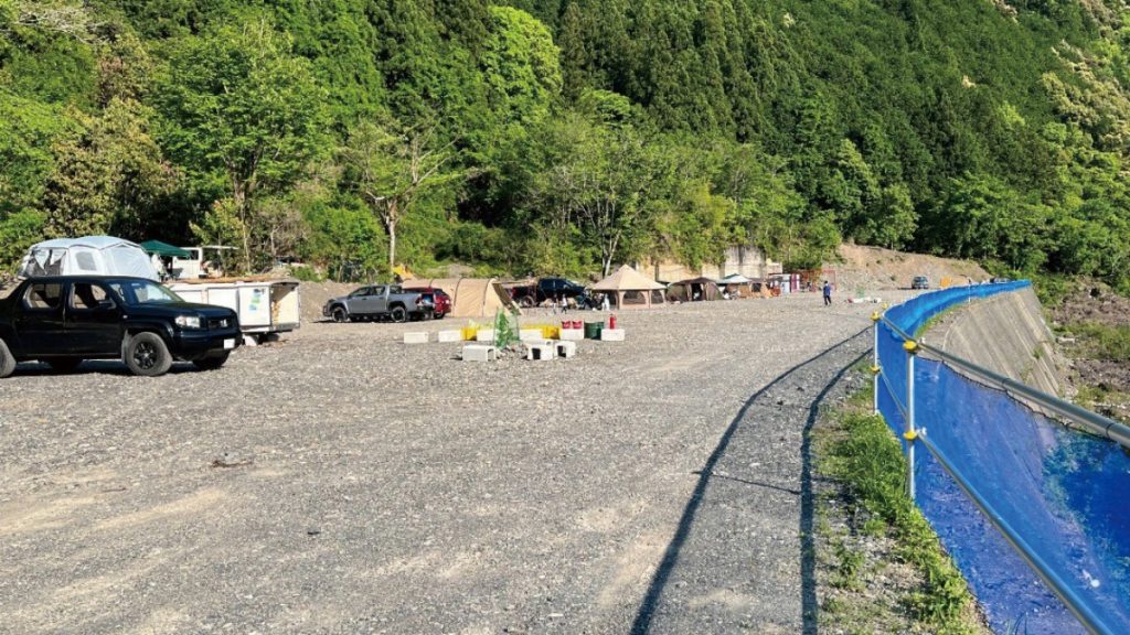 後ろは山、目の前は開放感あふれる川が広がる絶好のロケーション!広々フリーサイトと区画サイトの2種類あり、どちらも車の横付けが可能。夜は空一面に広がるきれいな星空を見ることができ、初夏には蛍を楽しむこともできる。簡易プールや水鉄砲も用意されているので、子どもたちも大喜び♪