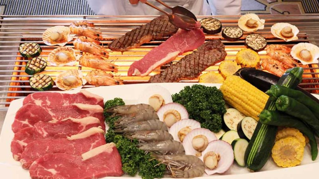 スズキの香草風味のオーブン焼き/ガーリックシュリンプ/黒毛和牛のローストビーフ/ヤマトポークのステーキ 茸とポルチーニのソース/お造り盛り合わせ/にぎり寿司/ハンバーグ/海老フライ/夏野菜のグリーンカレー/じゃがいもの冷製スープ/チョコレートファウンテンなど