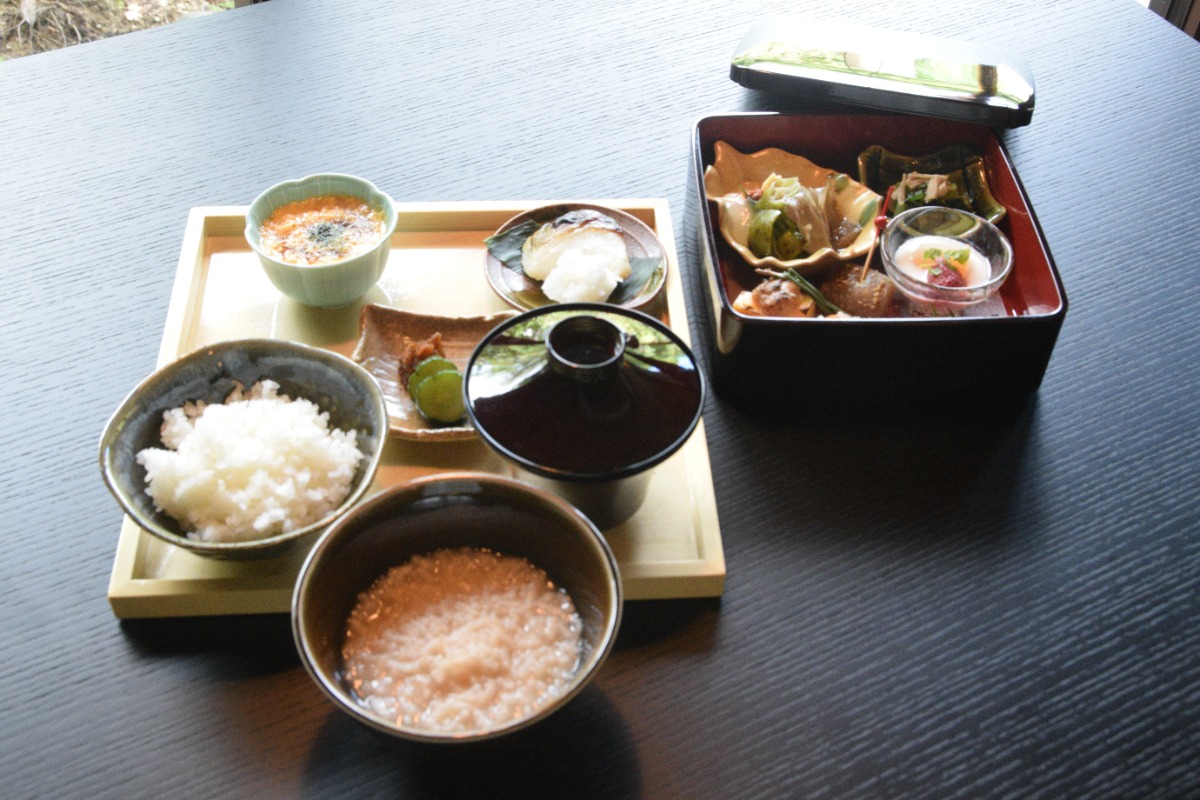 朝食は奈良県の郷土料理「茶粥」や吉野の卵を使った奈良県食材を使った一品が多数あり。