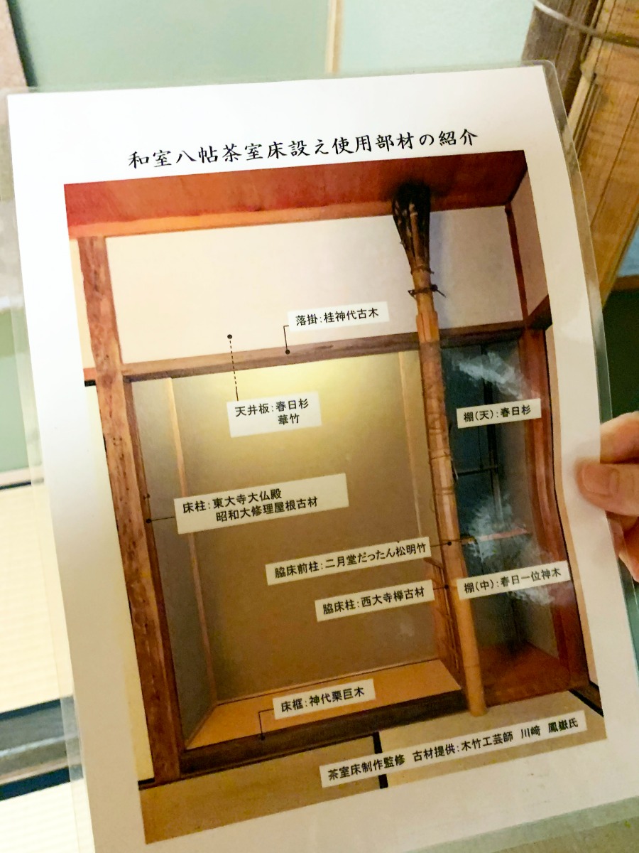 この「和室八帖茶室床設え」には他にも、床柱に「東大寺大仏殿の屋根の古材」が使われたりと、奈良を感じられるスペースとなっている。