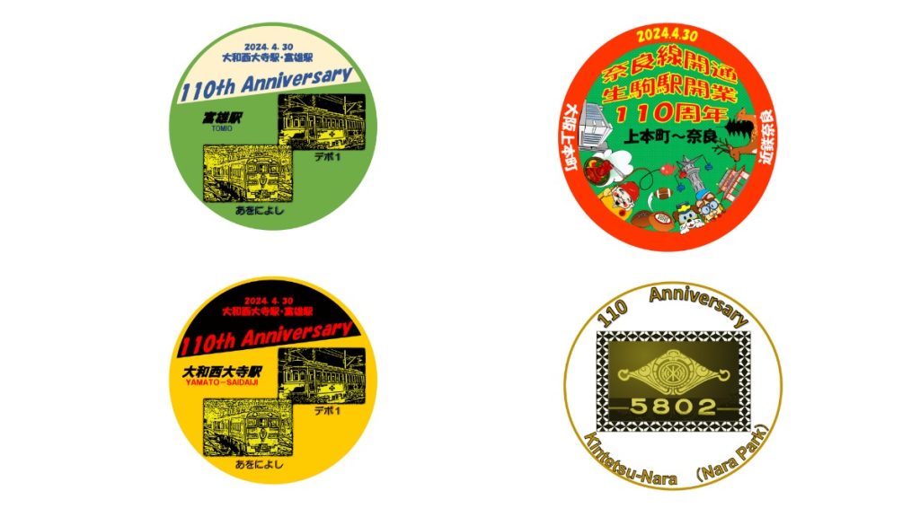 『株式会社ジェイアール東日本企画』が提供する駅スタンプアプリ「エキタグ」では、近畿日本鉄道(近鉄)の奈良線開通110周年を記念し、2024年4月27日(土)から、大和西大寺駅、富雄駅、近鉄奈良駅、生駒駅のスタンプデザインを110周年限定デザインに変更する。
