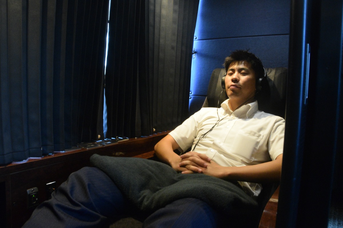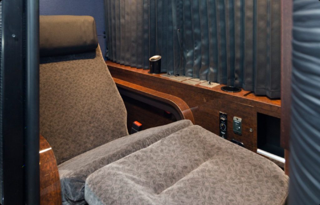 バスの最大の特徴は、なんといってもNASAが考案した「ゼログラビティ」理論に基づいた電動リクライニングシートであろう。